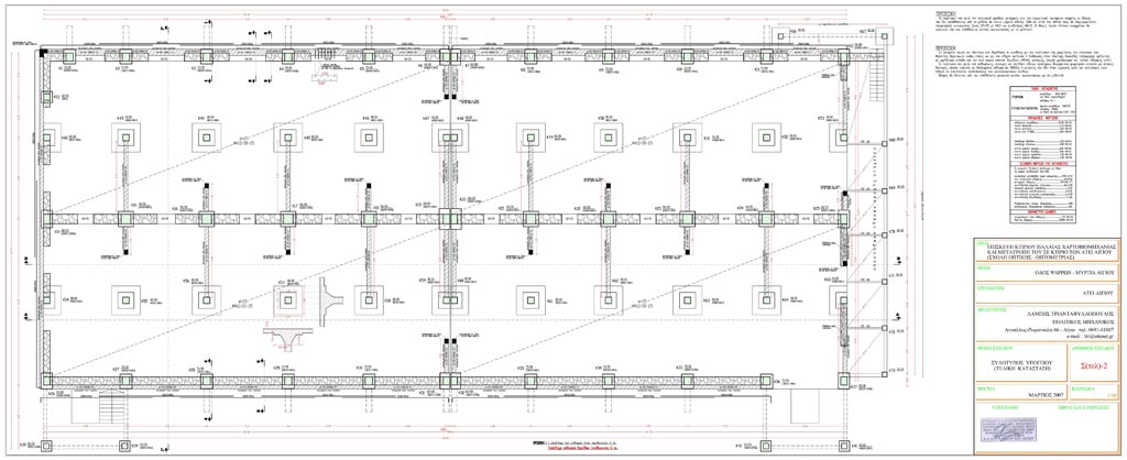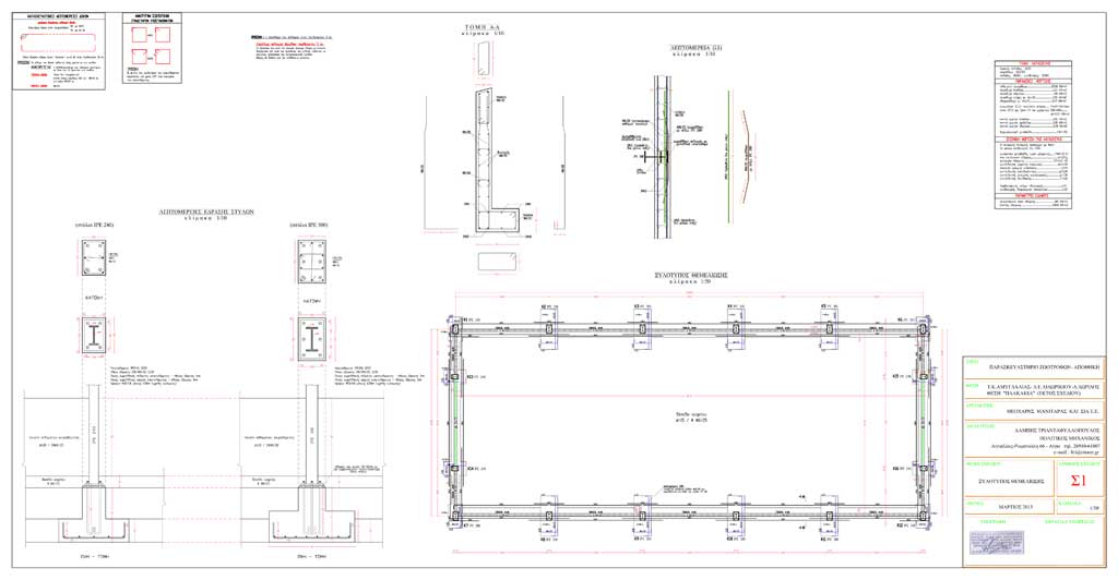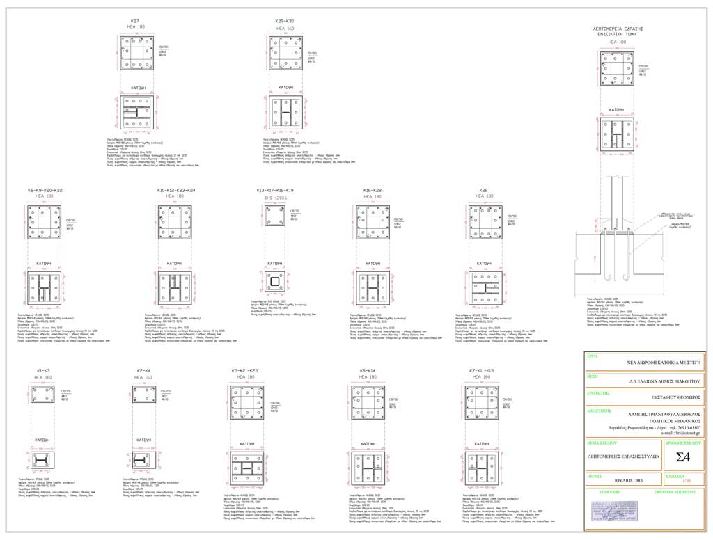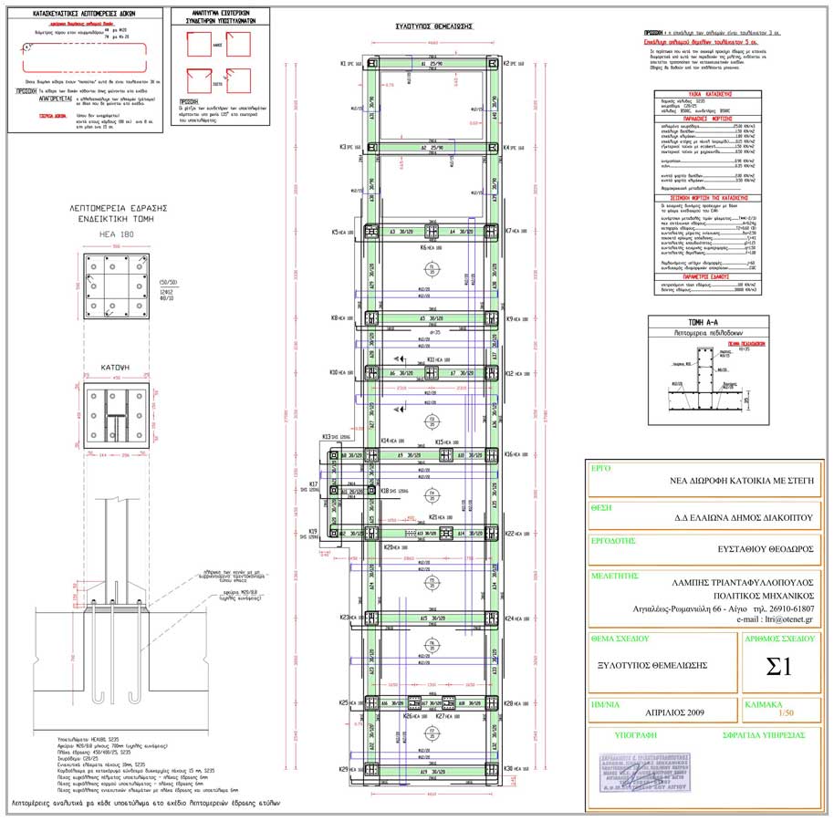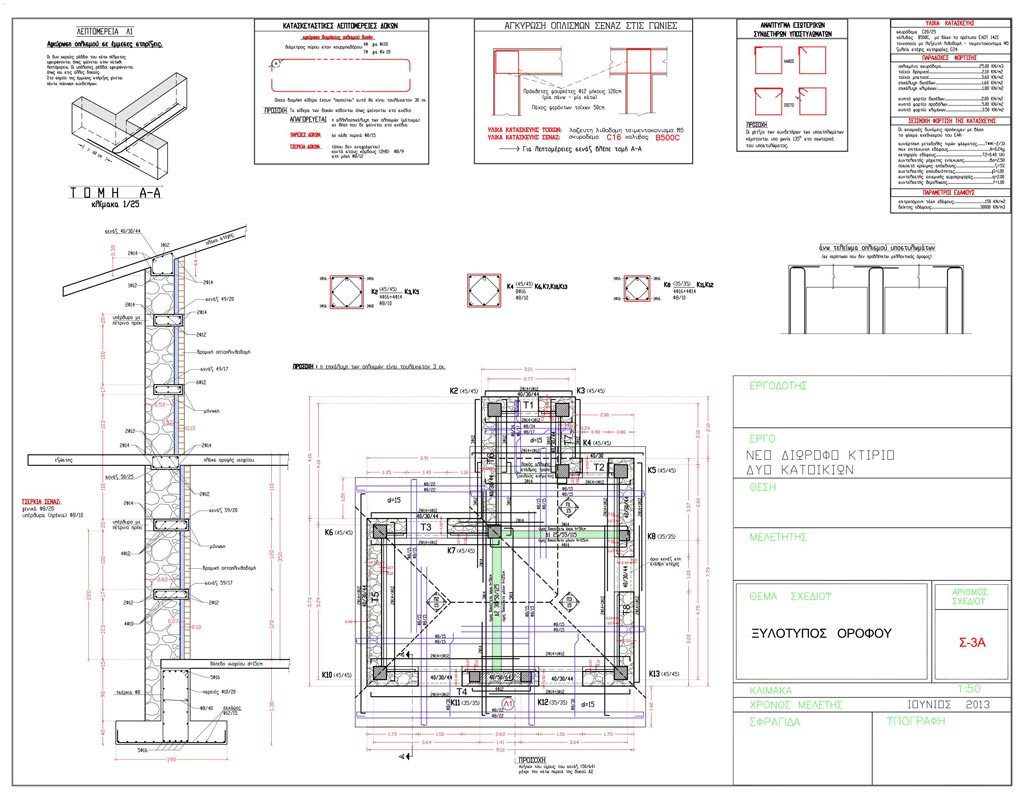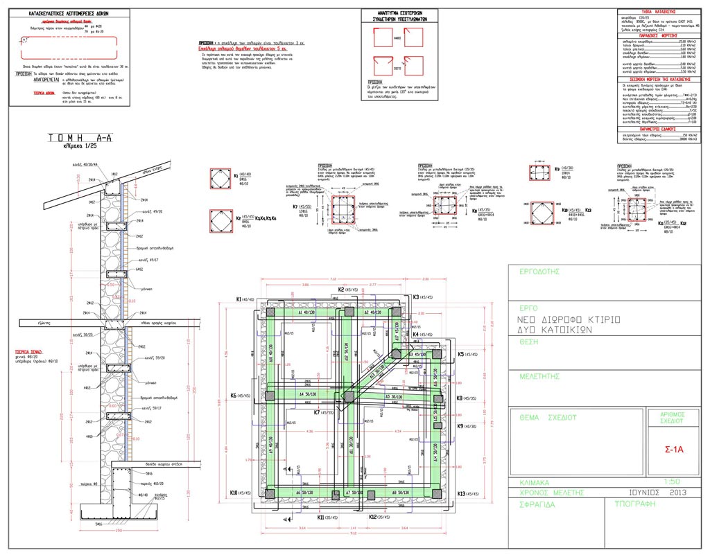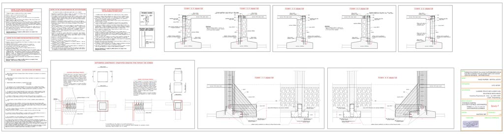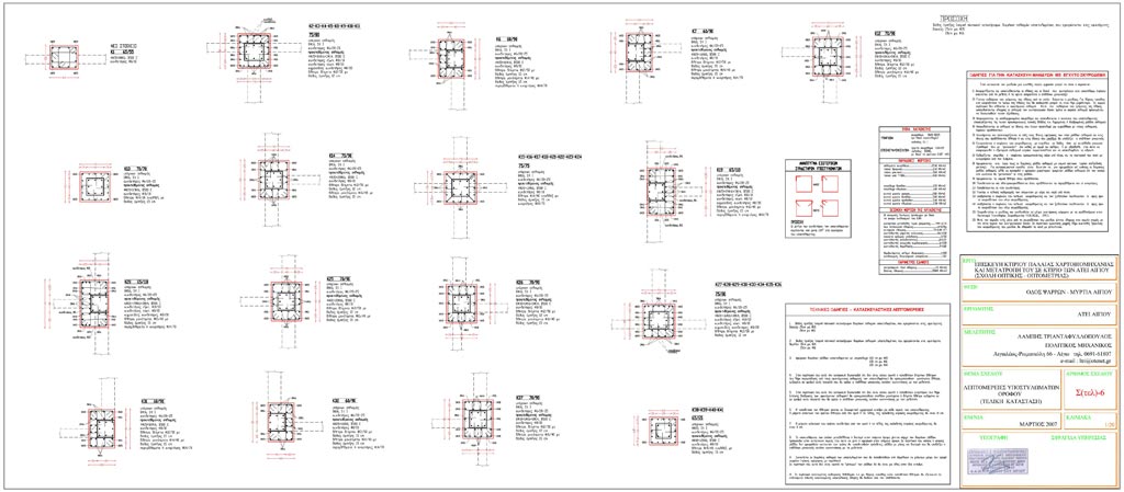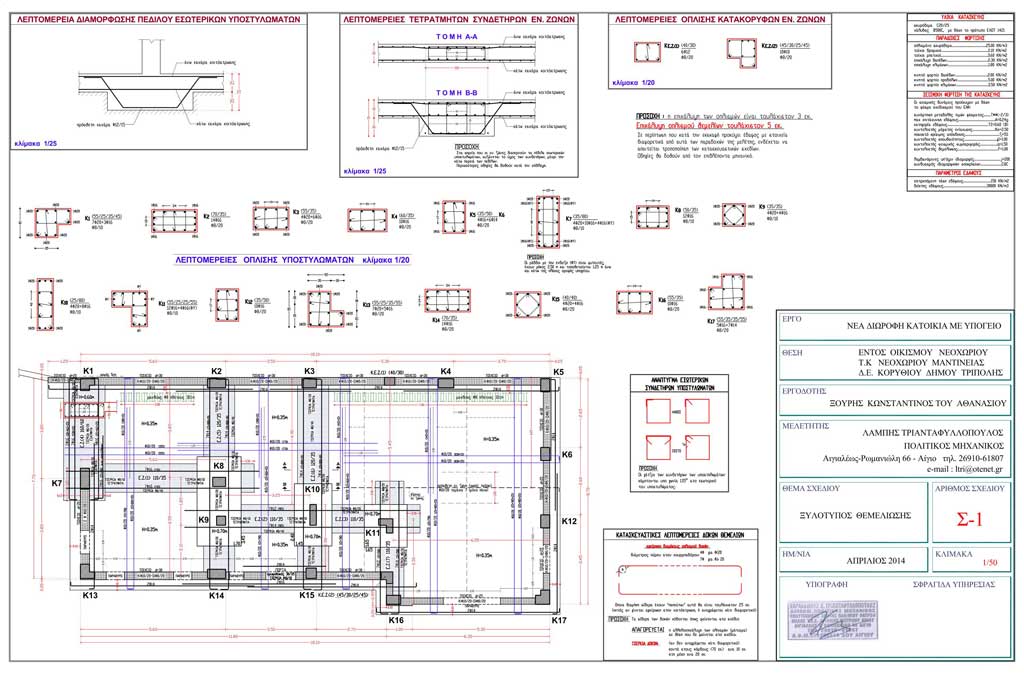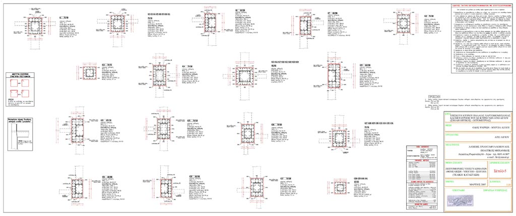 Η λεπτομερής σχεδίαση αποτελεί μία εργασία στην οποία δίνεται ιδιαίτερη έμφαση από το γραφείο μας. Τα σχέδια φτιάχνονται σχεδόν «εξ’αρχής» χωρίς το πλεονέκτημα από άποψης χρόνου της αυτοματοποίησης του υπολογιστή η οποία μπορεί μεν να εξοικονομεί χρόνο σχεδίασης, αλλά υστερεί σε αναλυτική παρουσίαση και κατασκευαστικές λεπτομέρειες, με αποτέλεσμα πολλές φορές τη σπατάλη των υλικών ή ακόμη και λάθη κατά την κατασκευή (π.χ. λανθασμένη τοποθέτηση διαμήκους οπλισμού δοκών και μάλιστα κάποιες φορές με επιζήμια αποτελέσματα για τον ικανοτικό έλεγχο κόμβων, μη σωστή διαμόρφωση μεταλλικών κόμβων κ.λ.π.). Έτσι, φροντίζουμε πάντα να εμπλουτίζονται τα σχέδια με τις απαραίτητες κατασκευαστικές λεπτομέρειες, έτσι ώστε να καθίσταται εύκολη η εφαρμογή της μελέτης στο εργοτάξιο ή και στο εργοστάσιο.