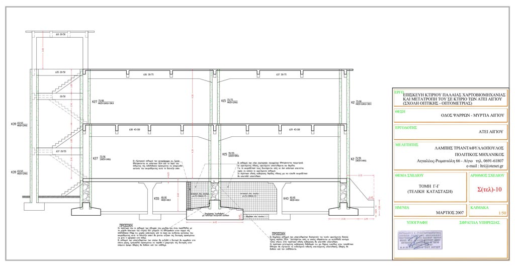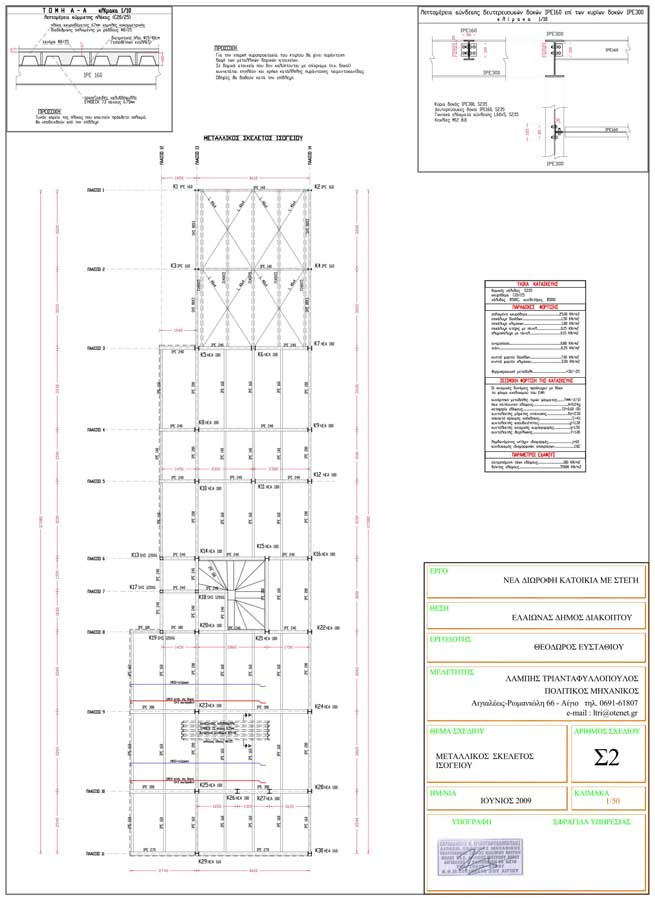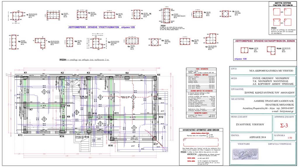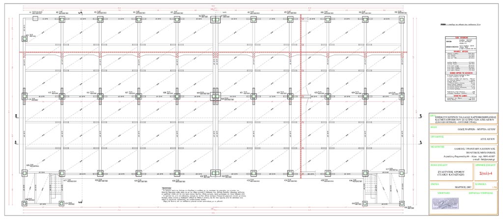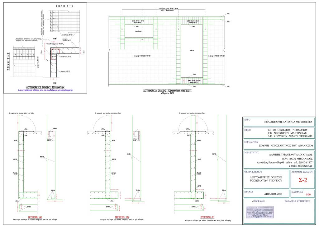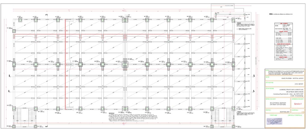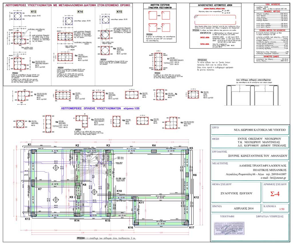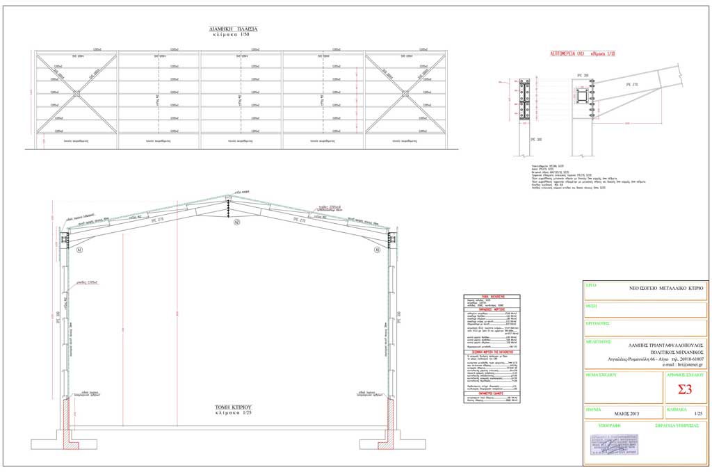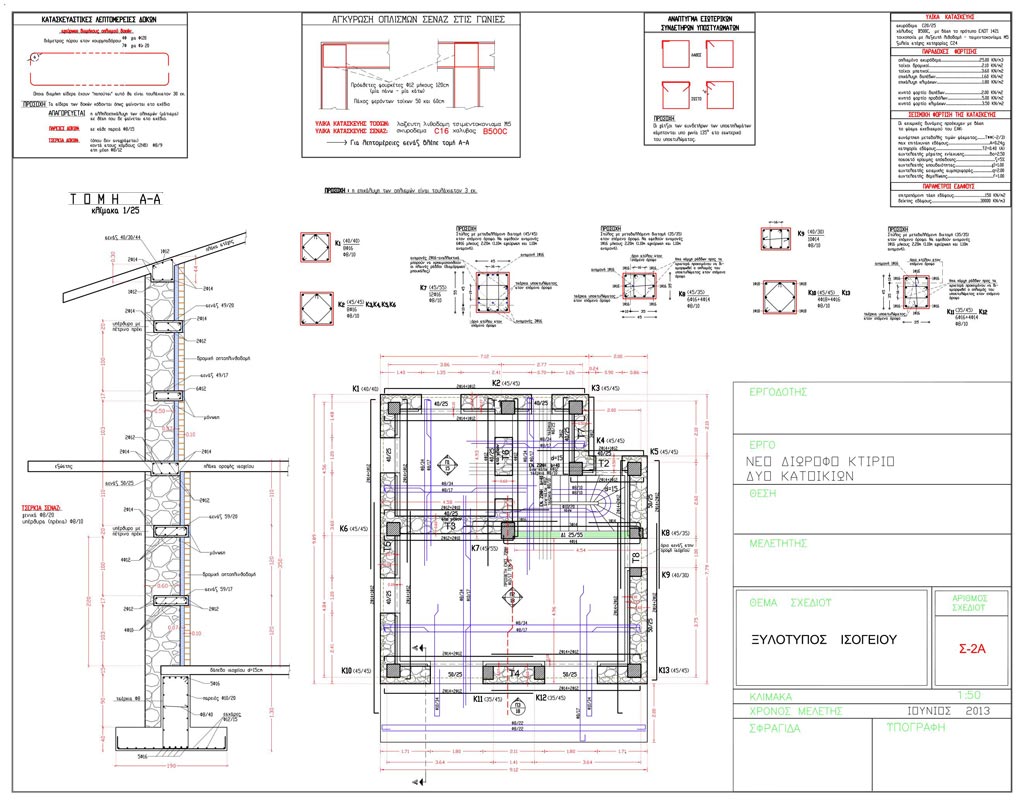 Η λεπτομερής σχεδίαση αποτελεί μία εργασία στην οποία δίνεται ιδιαίτερη έμφαση από το γραφείο μας. Τα σχέδια φτιάχνονται σχεδόν «εξ’αρχής» χωρίς το πλεονέκτημα από άποψης χρόνου της αυτοματοποίησης του υπολογιστή η οποία μπορεί μεν να εξοικονομεί χρόνο σχεδίασης, αλλά υστερεί σε αναλυτική παρουσίαση και κατασκευαστικές λεπτομέρειες, με αποτέλεσμα πολλές φορές τη σπατάλη των υλικών ή ακόμη και λάθη κατά την κατασκευή (π.χ. λανθασμένη τοποθέτηση διαμήκους οπλισμού δοκών και μάλιστα κάποιες φορές με επιζήμια αποτελέσματα για τον ικανοτικό έλεγχο κόμβων, μη σωστή διαμόρφωση μεταλλικών κόμβων κ.λ.π.). Έτσι, φροντίζουμε πάντα να εμπλουτίζονται τα σχέδια με τις απαραίτητες κατασκευαστικές λεπτομέρειες, έτσι ώστε να καθίσταται εύκολη η εφαρμογή της μελέτης στο εργοτάξιο ή και στο εργοστάσιο.